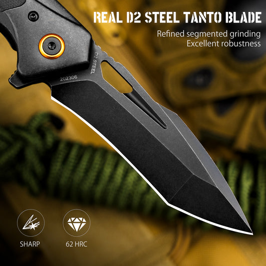 LOTHAR PHOENIX 5‘’ D2 Steel Blade Large Tactical Pocket Knife with Black G10 Handle, Flipper Assisted Opening